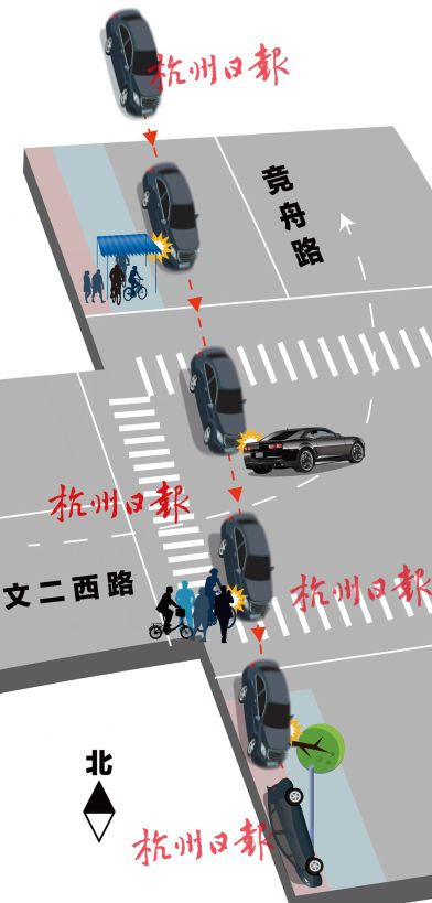 据现场目击者吕先生说,肇事的是一辆黑色SUV,由竞舟路北往南开,开到文二路口时,突然失控,先撞上了一辆电动车,然后撞翻了自行车道上的遮阳棚以及棚下的路人,接着又撞到了路边的隔离墩和其他车辆。